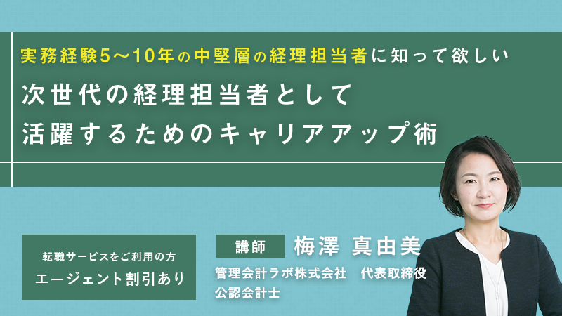 このセミナーでは、「経理の勉強法!(中央経済社)」の著者でもお馴染みの公認会計士の梅澤真由美先生が、事業会社にて経理担当者、管理職としての経験、社外監査役として経理部門をみた外部からの視点を踏まえ「次世代の経理担当者として活躍するためのキャリアアップ術」を余すことなくお伝えします。