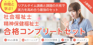 「社会福祉士・精神保健福祉士合格コンプリートセット」は、ふくし合格ネットのメイン教材である「合格フルセット」に、Zoomのリアルタイム講義と、仲間と学ぶ要素をもたせた超充実の最強セットになります。内容は、以下の①~⑤です。