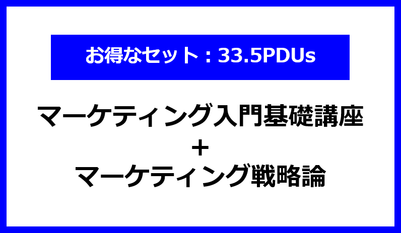 本コースは「これだけは知っておきたい 短期間集中「マーケティング入門基礎講座」 (18PDU)」と「ビジネスリーダーが知っておきたい「マーケティング戦略論」(15.5PDU)」のお得なセットコースとなります。