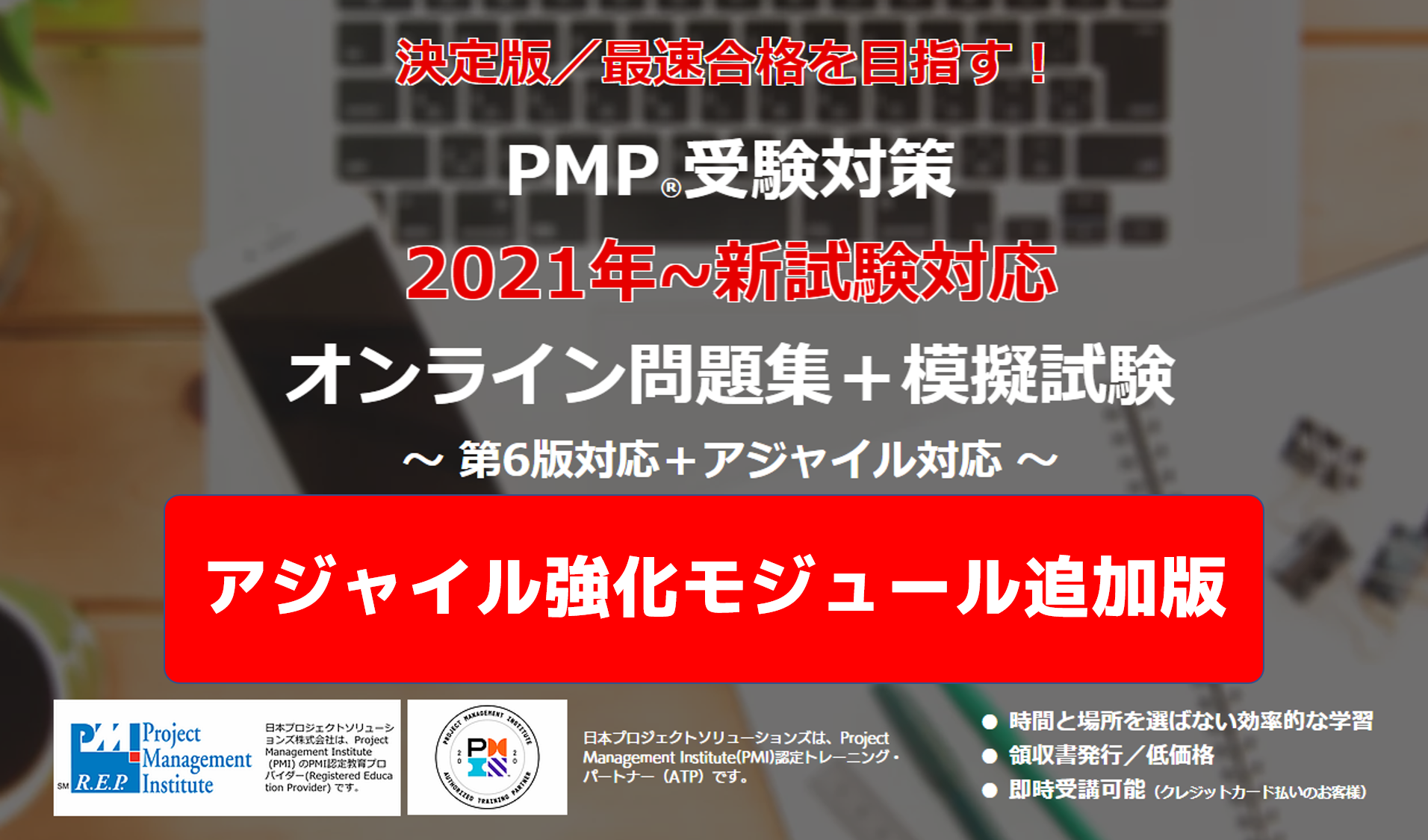 ※本商品はお客様よりリクエストが多かった「【2021年新試験対応】【決定版】PMP®受験対策 オンライン問題集+模擬試験」に更に100問のアジャイル追加問題を追加した「アジャイル強化版」です(追加部分の詳細は以下をご参照ください)。