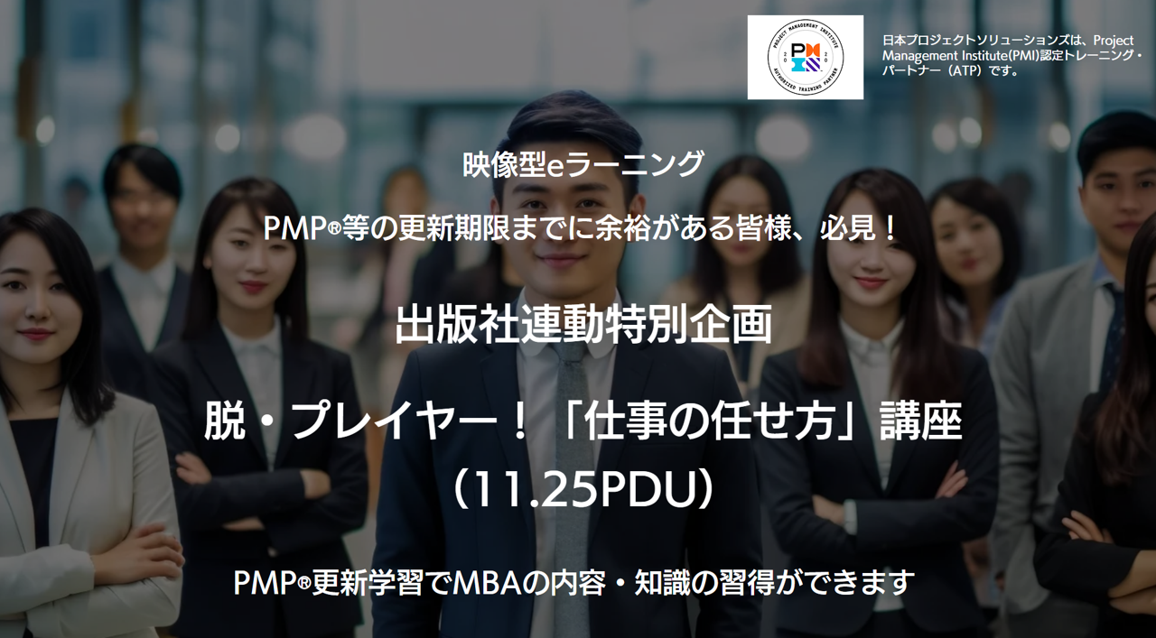 ※本コースはテキストとして指定図書を受講者様ご自身にてご購入いただき、指定図書をお読みいただき、また映像型eラーニングをご覧いただき、最終クイズ(11問)にご回答いただく事でPDUを発行いたします。