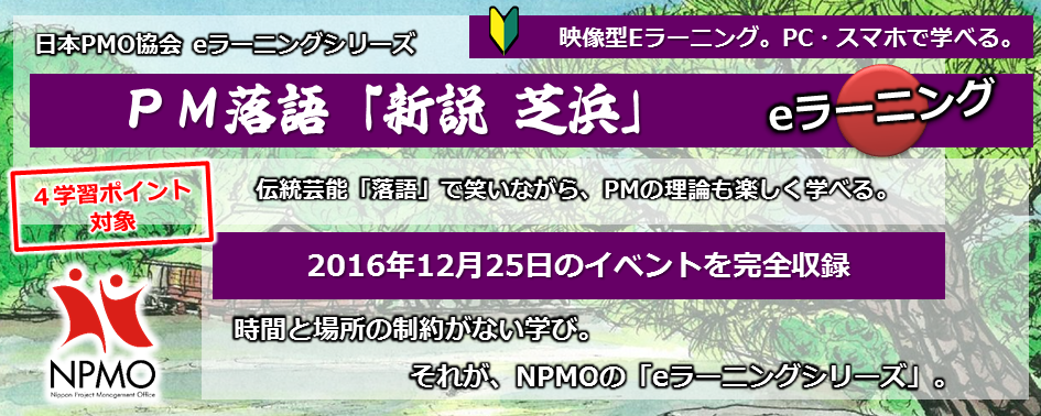 ●2016年12月25日に実施し大好評だったPM落語「新説 芝浜」を完全収録した映像型eラーニングコンテンツです。