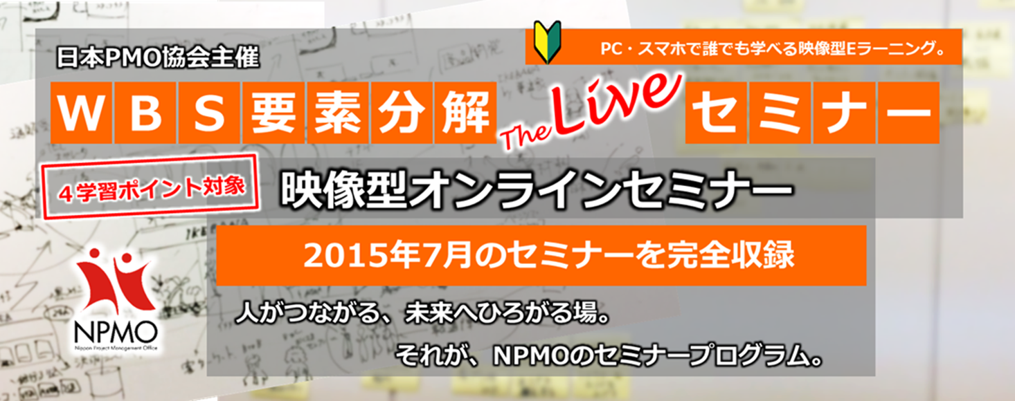 - NPMOオンラインセミナー(WBS要素分解”The Live”セミナー) NPMOオンラインセミナー(WBS要素分解”The Live”セミナー) NPMOオンラインセミナー(WBS要素分解”The Live”セミナー)