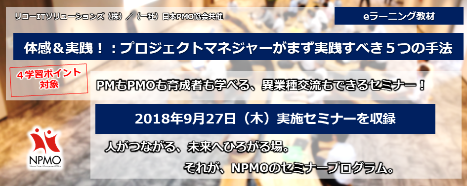 - NPMOオンラインセミナー(体感&実践!プロジェクトマネジャーがまず実践すべき5つの手法) NPMOオンラインセミナー(体感&実践!プロジェクトマネジャーがまず実践すべき5つの手法) NPMOオンラインセミナー(体感&実践!プロジェクトマネジャーがまず実践すべき5つの手法)